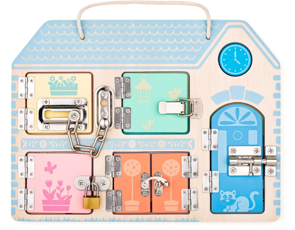 Tréninkem zavírání a odemykání různého typu zámečků trénuje dítě tuto dovednost a zároveň zlepšuje jemnou motoriku. Design českého výtvarníka.